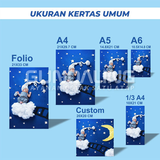 Bahan : HVS 80-100 gsm, Artpaper 100-150, Mattepaper 120-150,Artcarton 210-310 gsm, Fancy Paper (Blues White, Linen, Concorde, Pyramid, New Top), Ivory 270-300 gsm