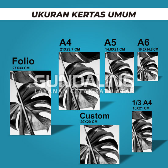 • Bahan                : HVS 80-100 gsm, Artpaper 100-150, Mattepaper 120-150,Artcarton 210-310 gsm, Fancy Paper (Blues White, Linen, Concorde, Pyramid, New Top), Ivory 270-300 gsm